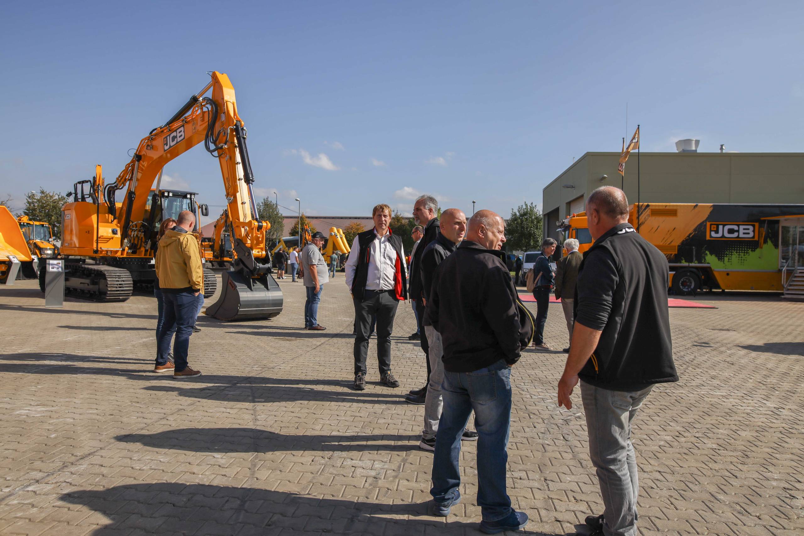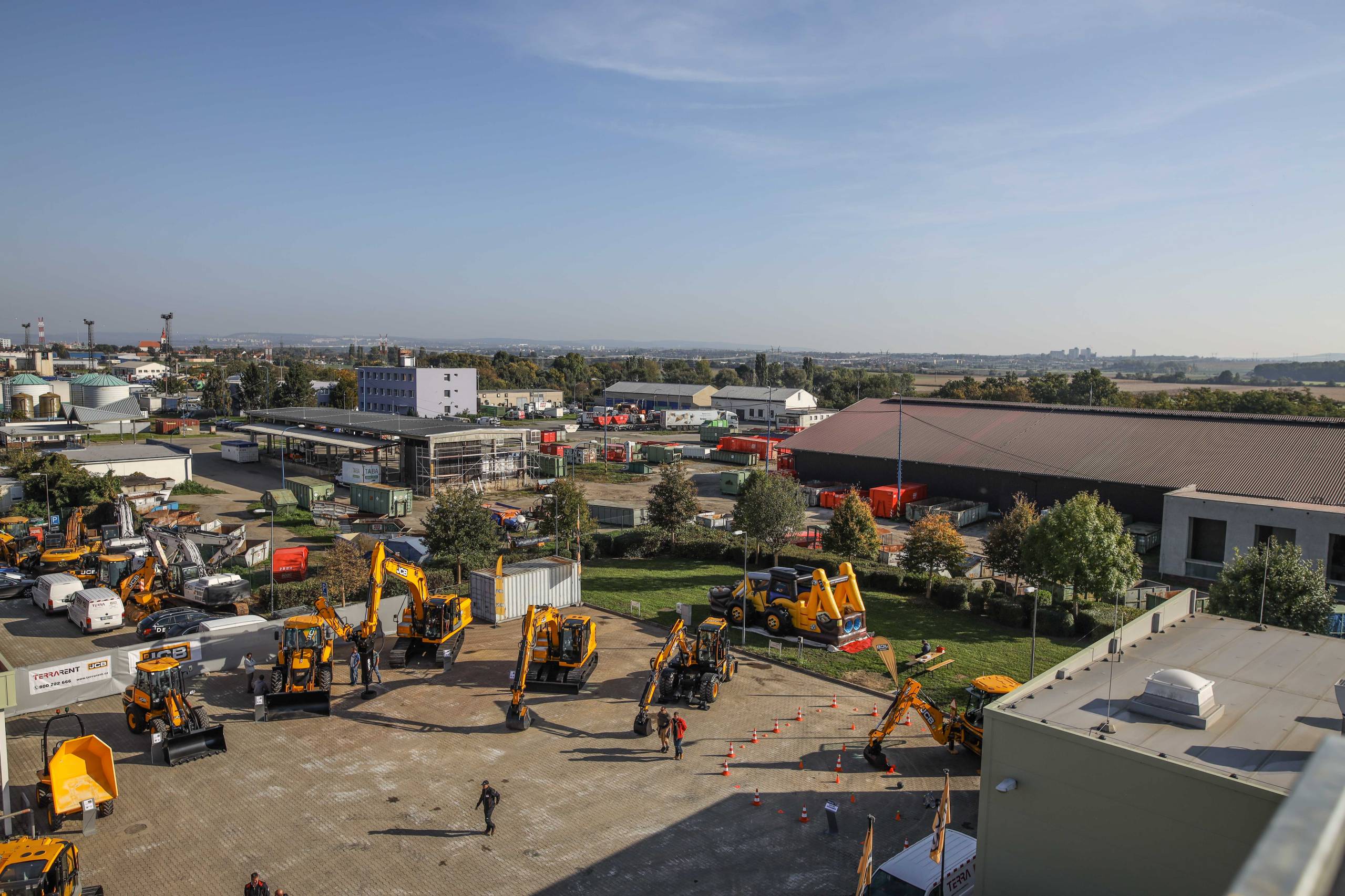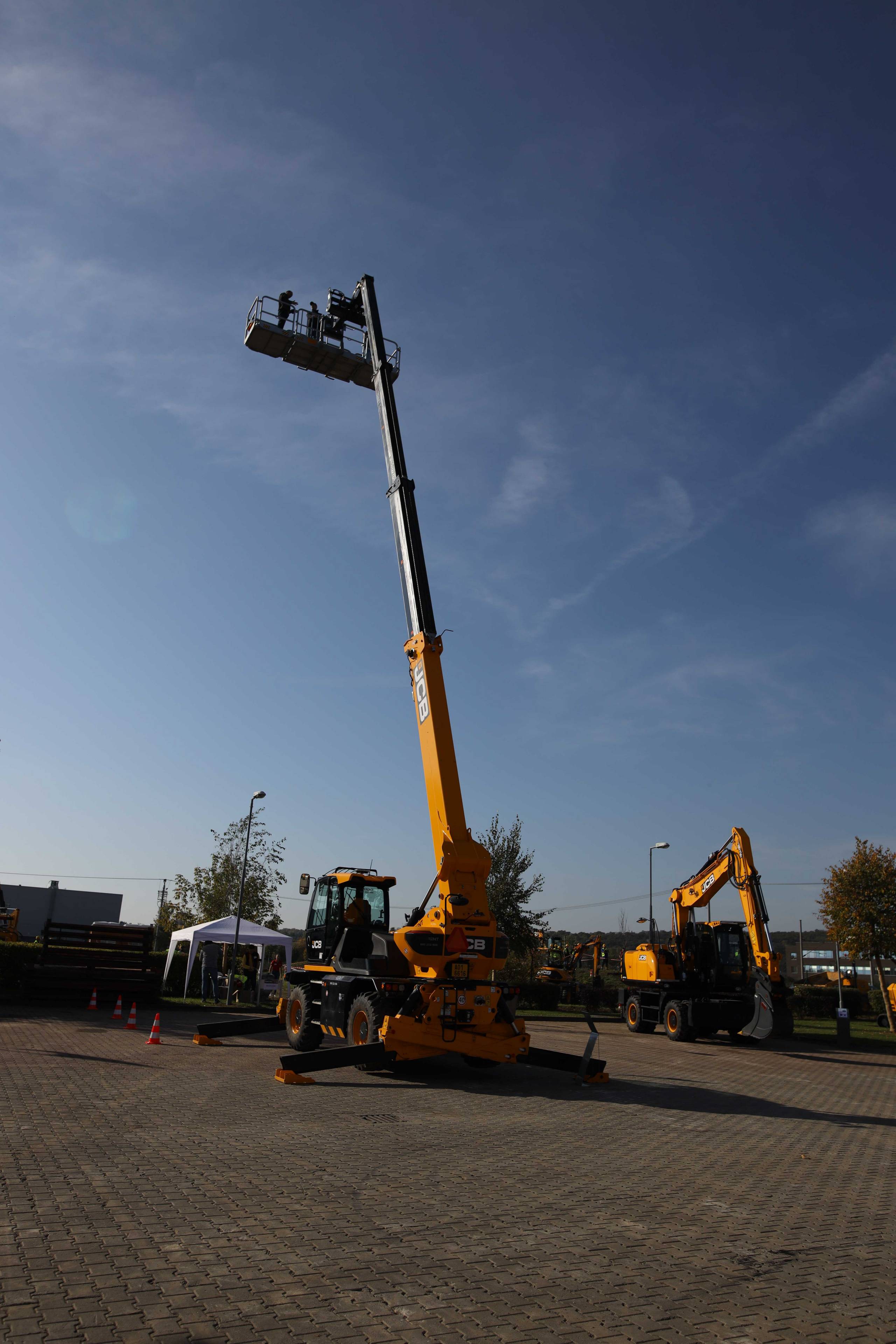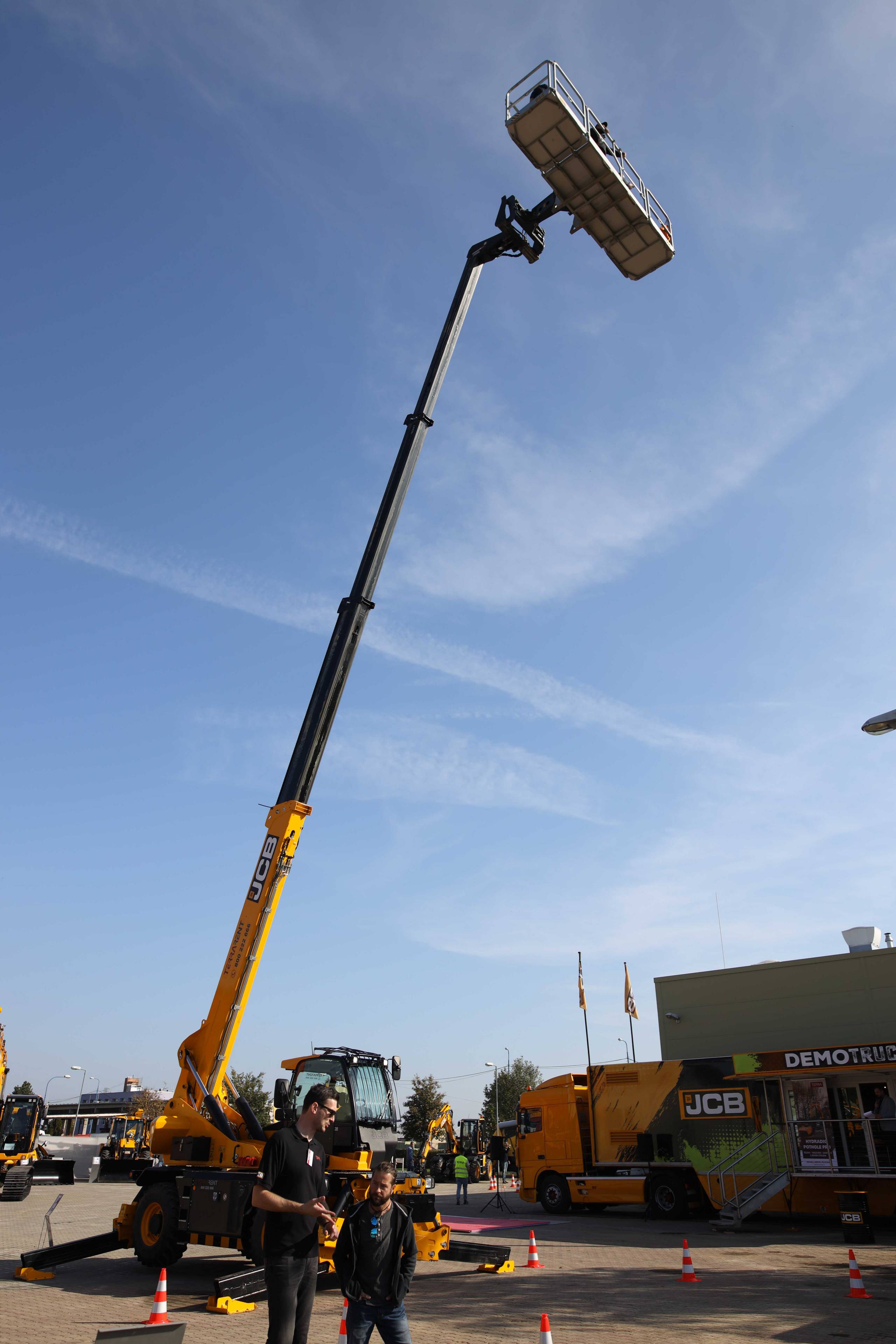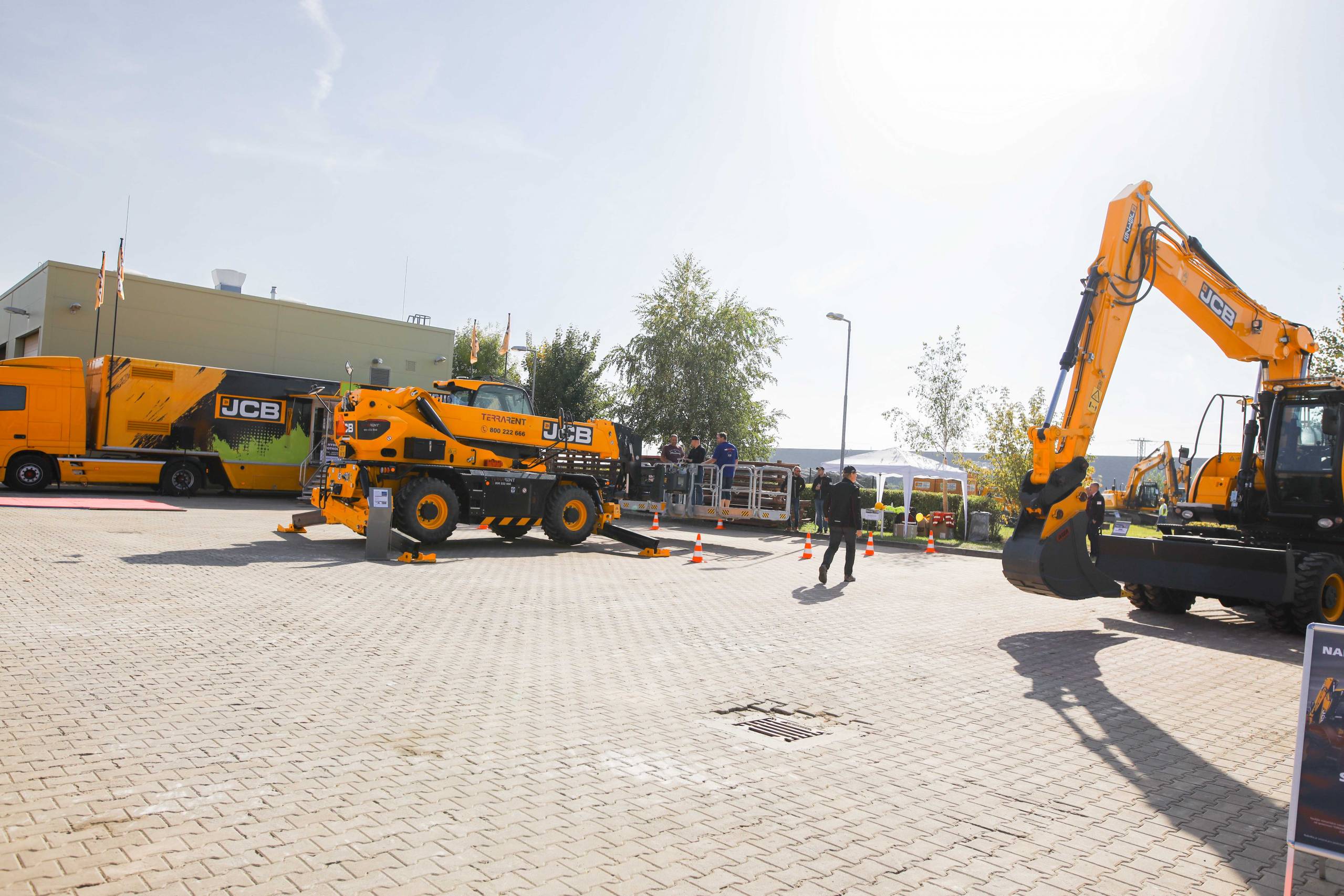 Na odstavné ploše byly zastoupeny téměř všechny naše stroje od MINI/MIDI, přes trakorbagry až po 24 tunová pásová rýpadla. Dále byly představeny naše hlavní JCB novinky unikátní Hydradig Pothole Pro určený k opravě výtluků, pásové rýpadlo JCB 245XR se zkrácenou zádí, rotační teleskopický manipulátor JCB 555-210R doplněný o plošinu na které bylo možné užít si výhled na celý areál z výšky až 21 metrů.
