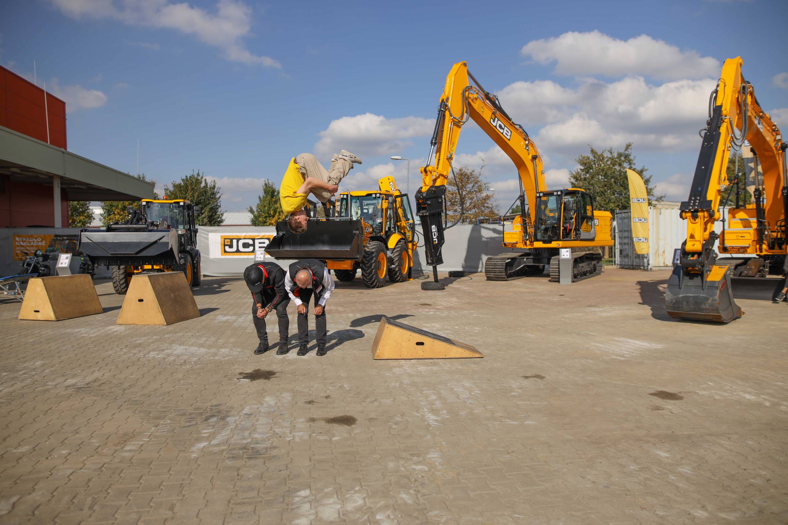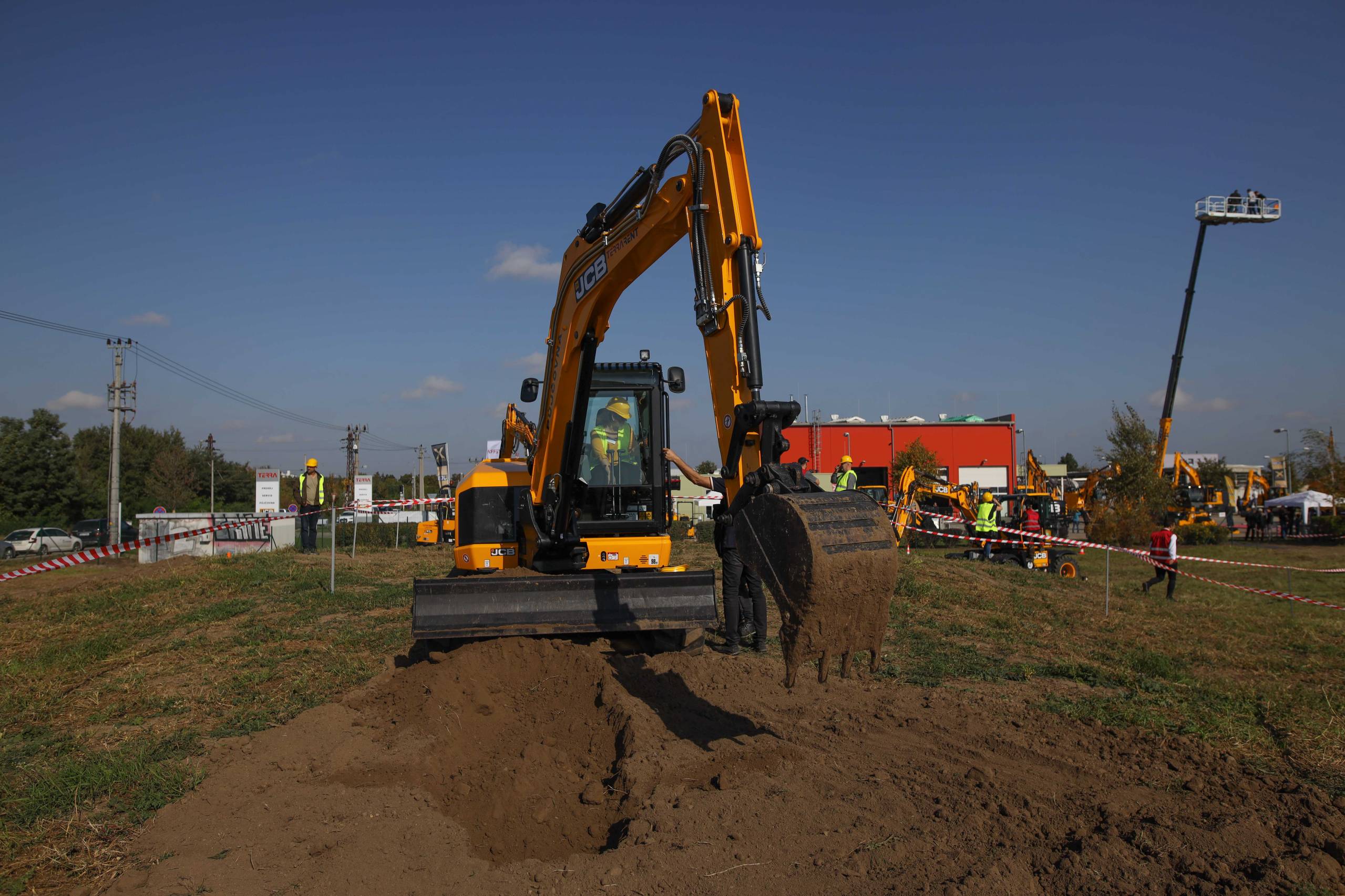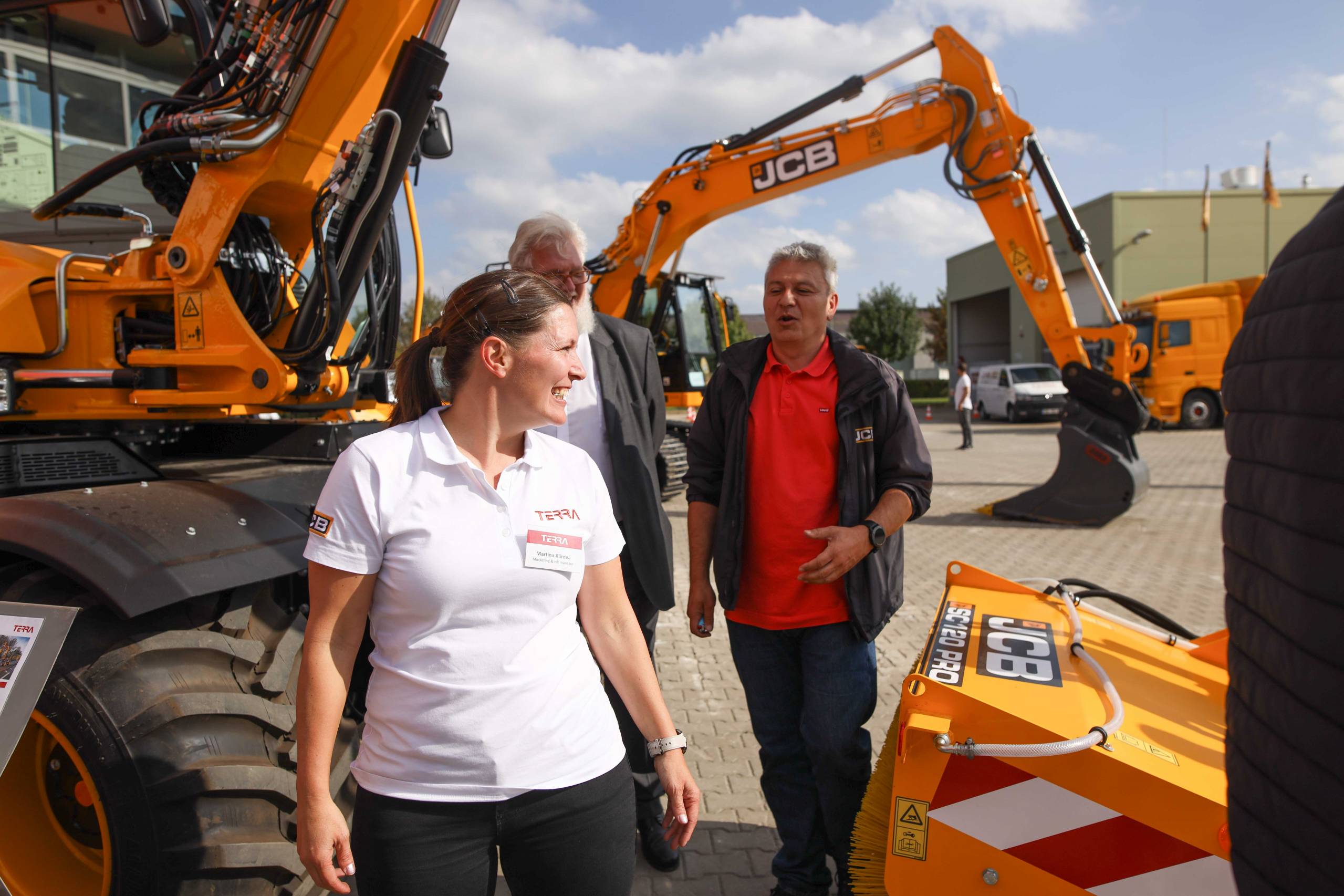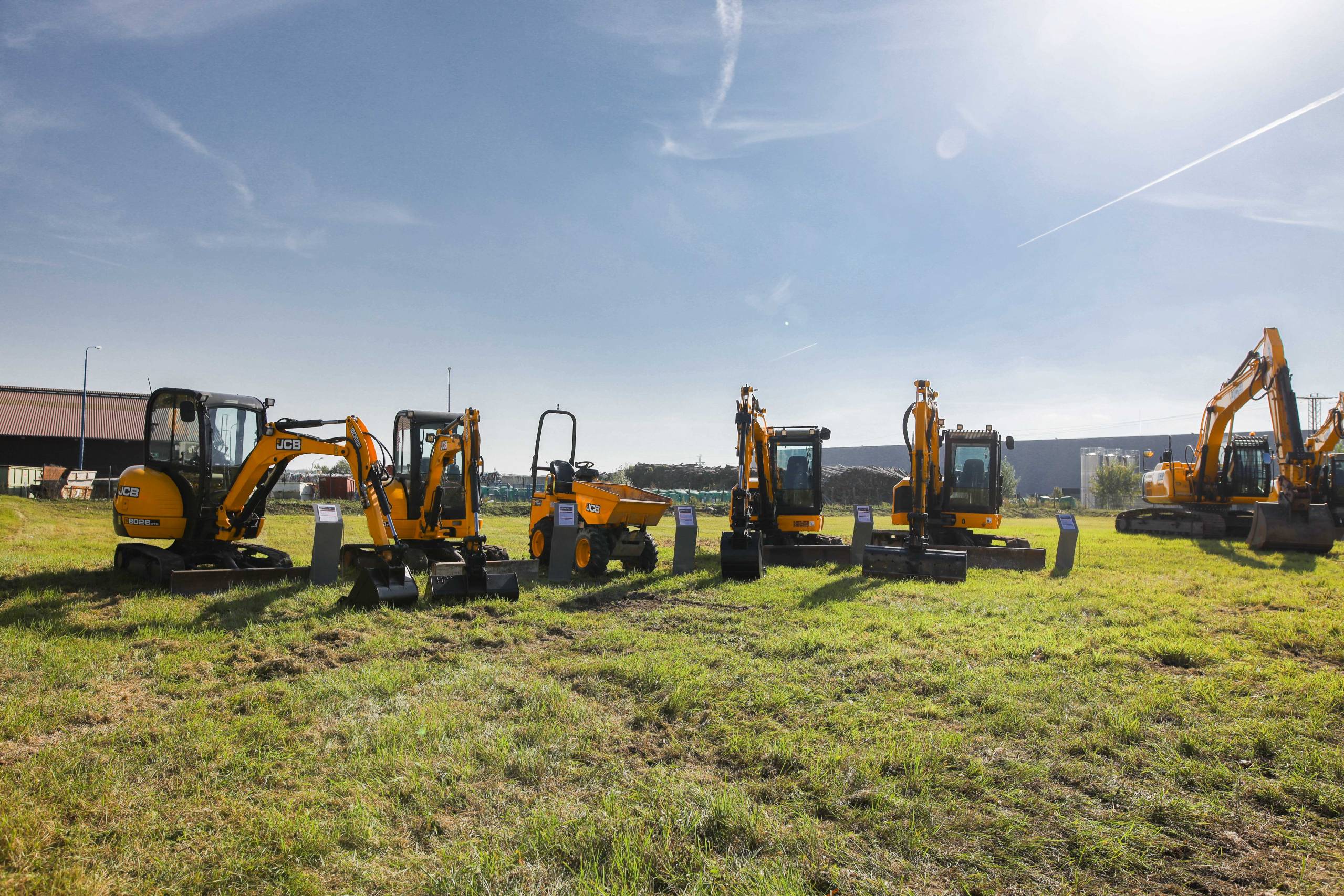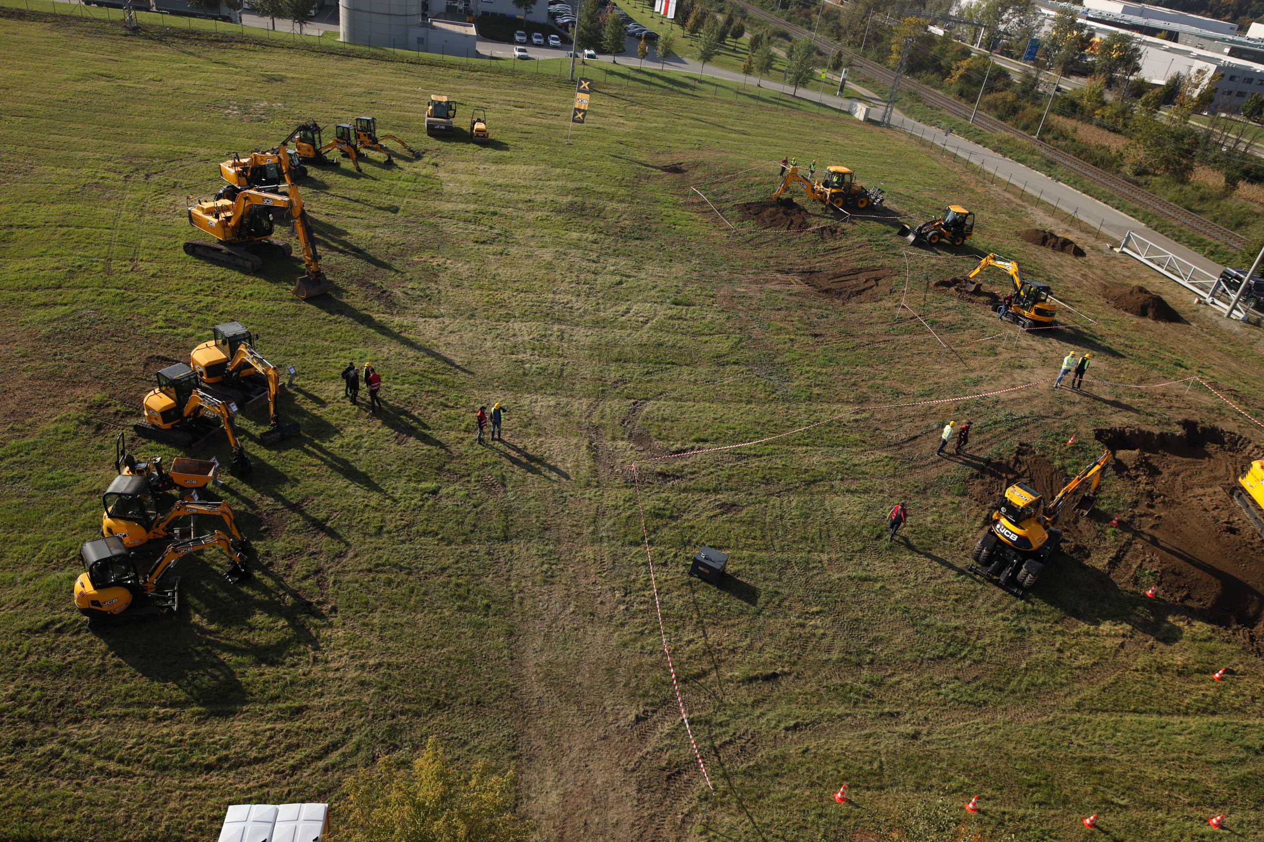 Na odstavné ploše byly zastoupeny téměř všechny naše stroje od MINI/MIDI, přes trakorbagry až po 24 tunová pásová rýpadla. Dále byly představeny naše hlavní JCB novinky unikátní Hydradig Pothole Pro určený k opravě výtluků, pásové rýpadlo JCB 245XR se zkrácenou zádí, rotační teleskopický manipulátor JCB 555-210R doplněný o plošinu na které bylo možné užít si výhled na celý areál z výšky až 21 metrů.