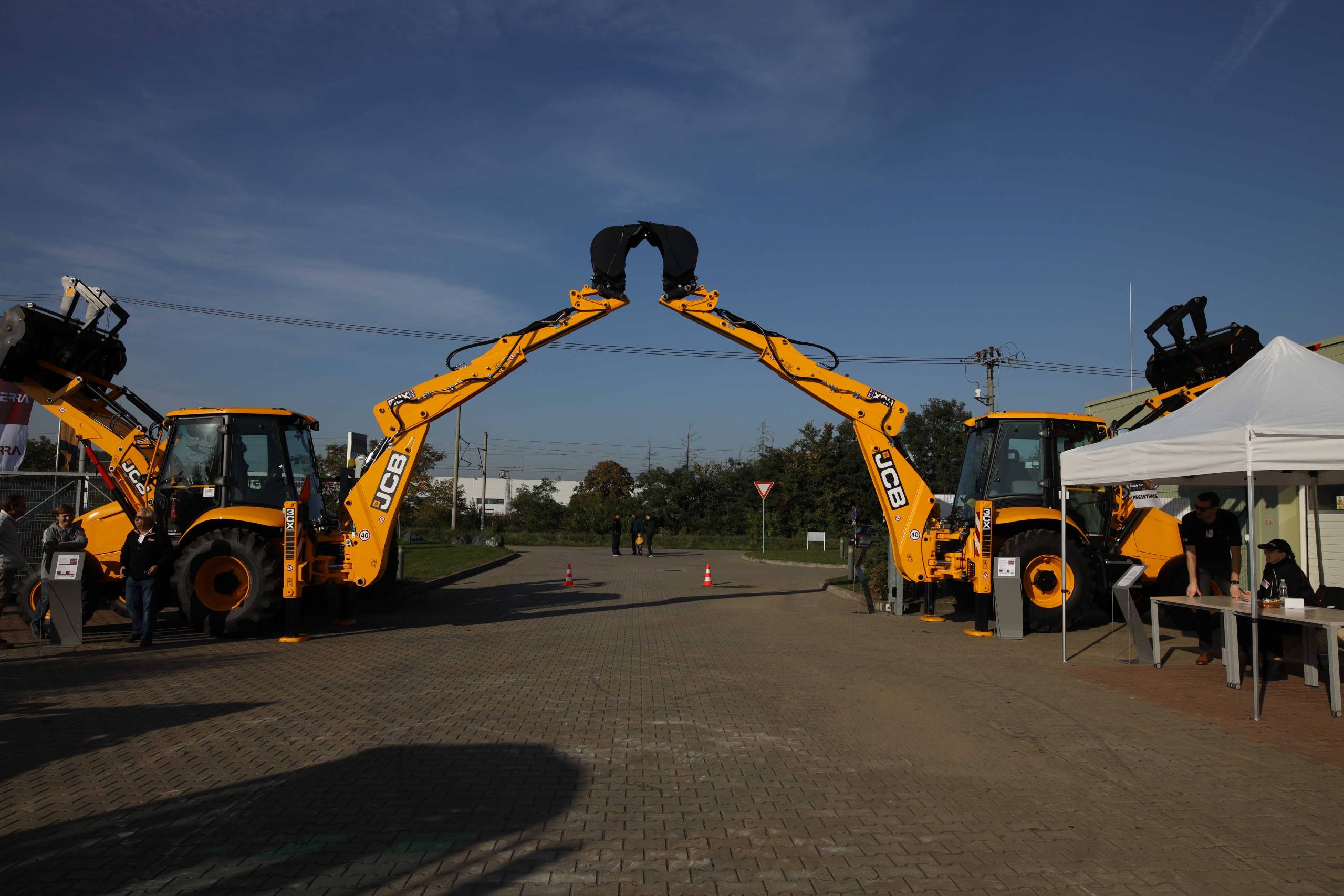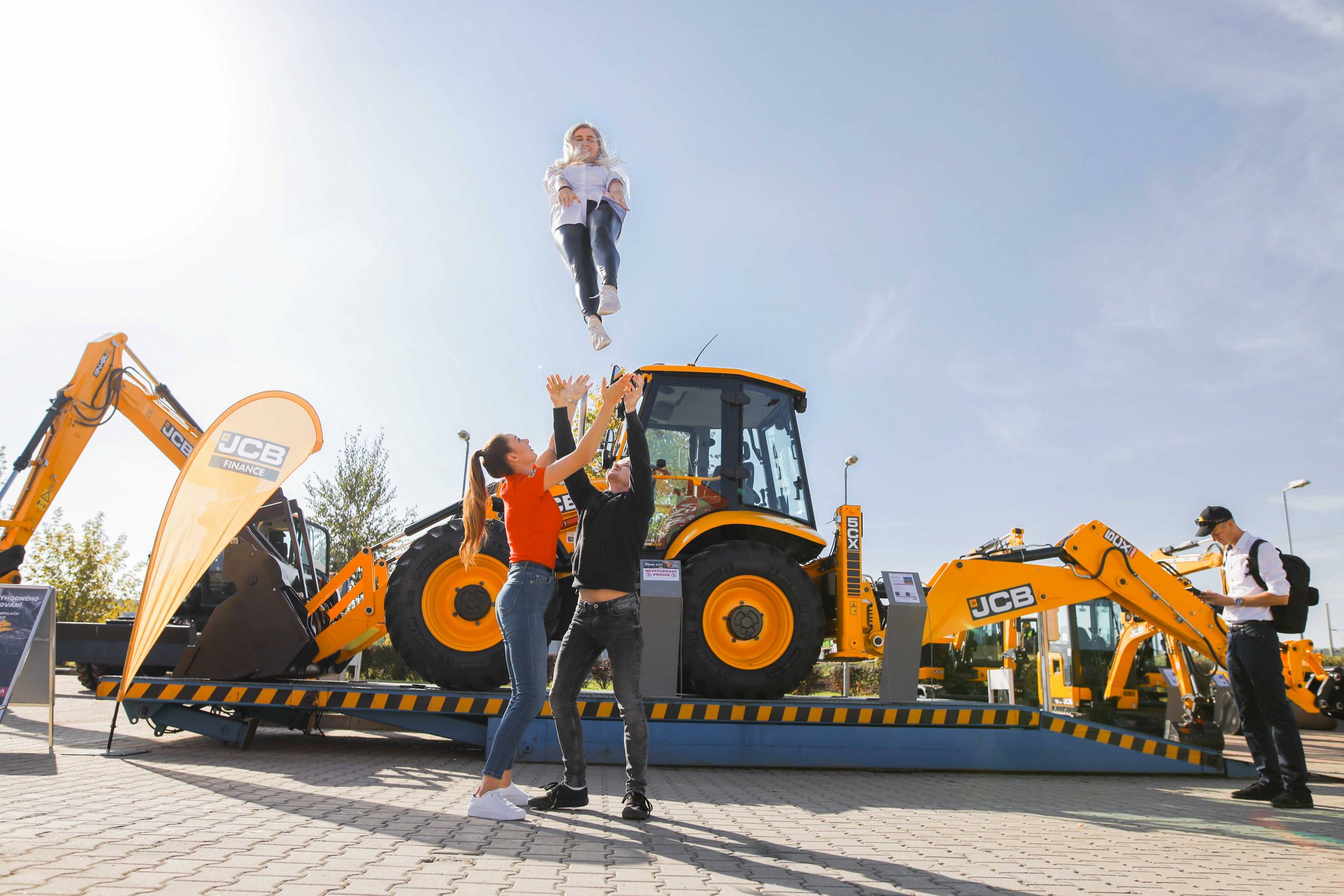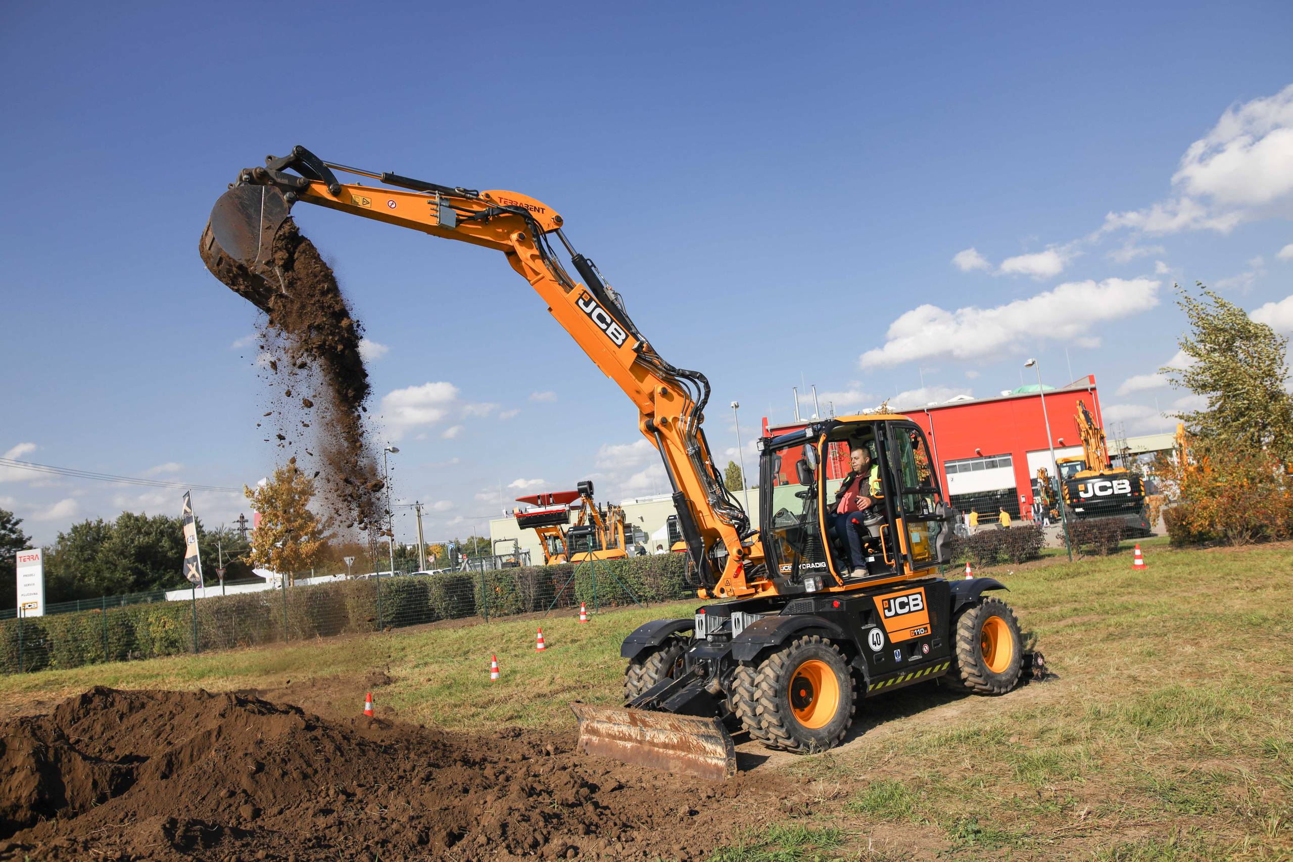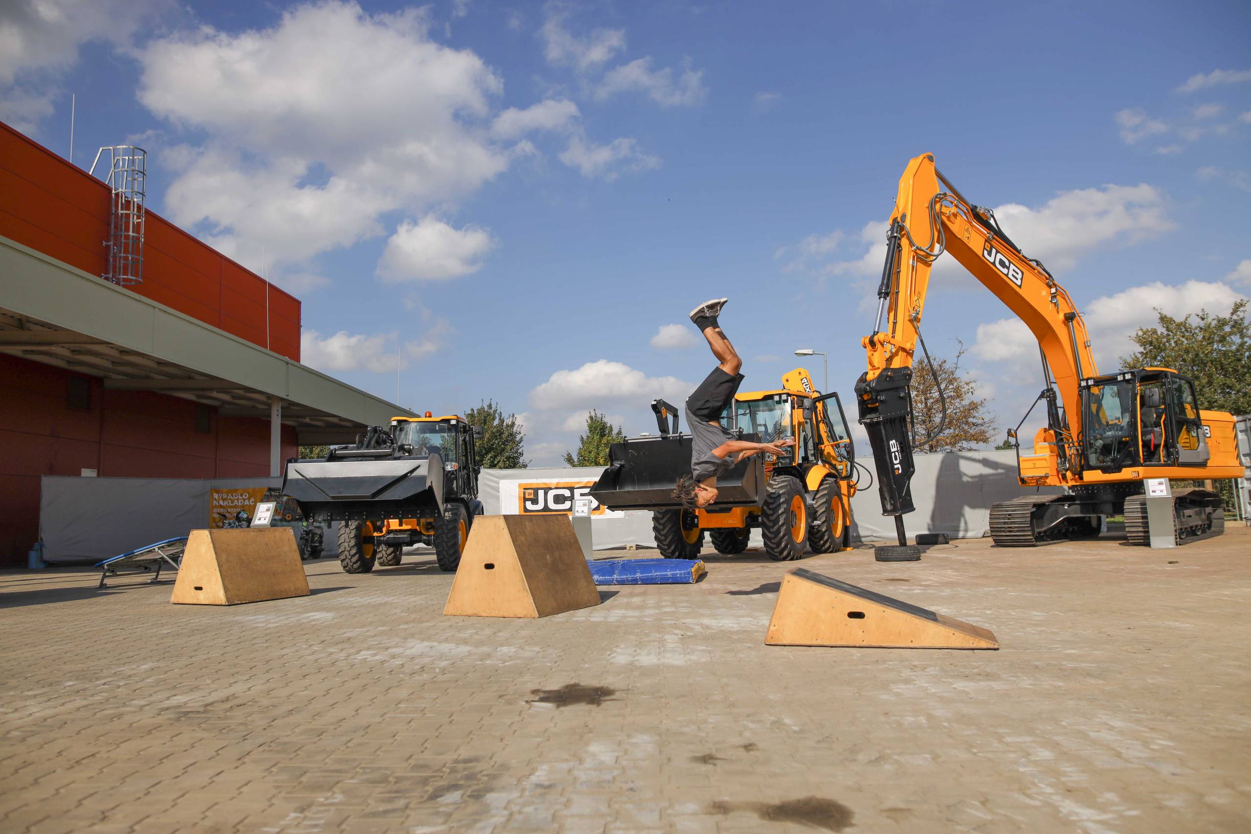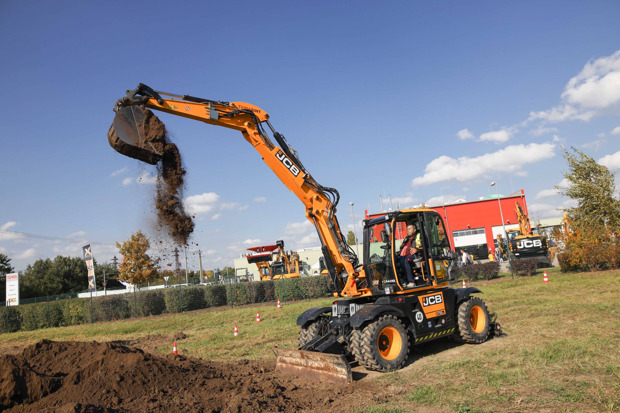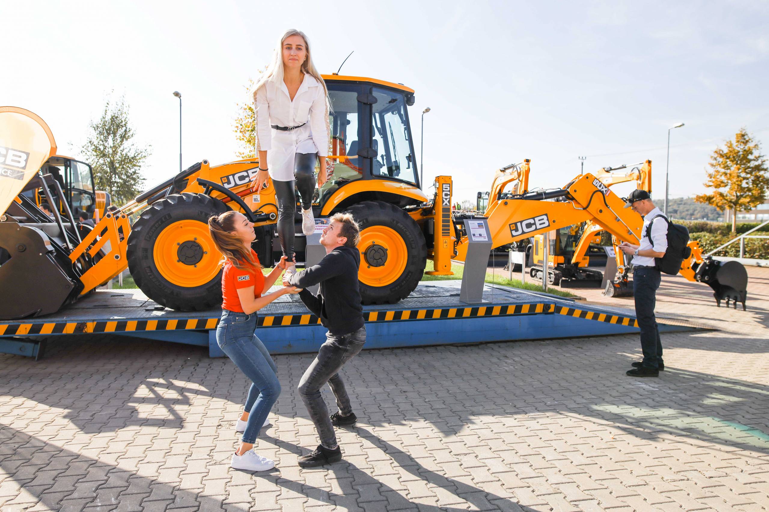 Na odstavné ploše byly zastoupeny téměř všechny naše stroje od MINI/MIDI, přes trakorbagry až po 24 tunová pásová rýpadla. Dále byly představeny naše hlavní JCB novinky unikátní Hydradig Pothole Pro určený k opravě výtluků, pásové rýpadlo JCB 245XR se zkrácenou zádí, rotační teleskopický manipulátor JCB 555-210R doplněný o plošinu na které bylo možné užít si výhled na celý areál z výšky až 21 metrů.