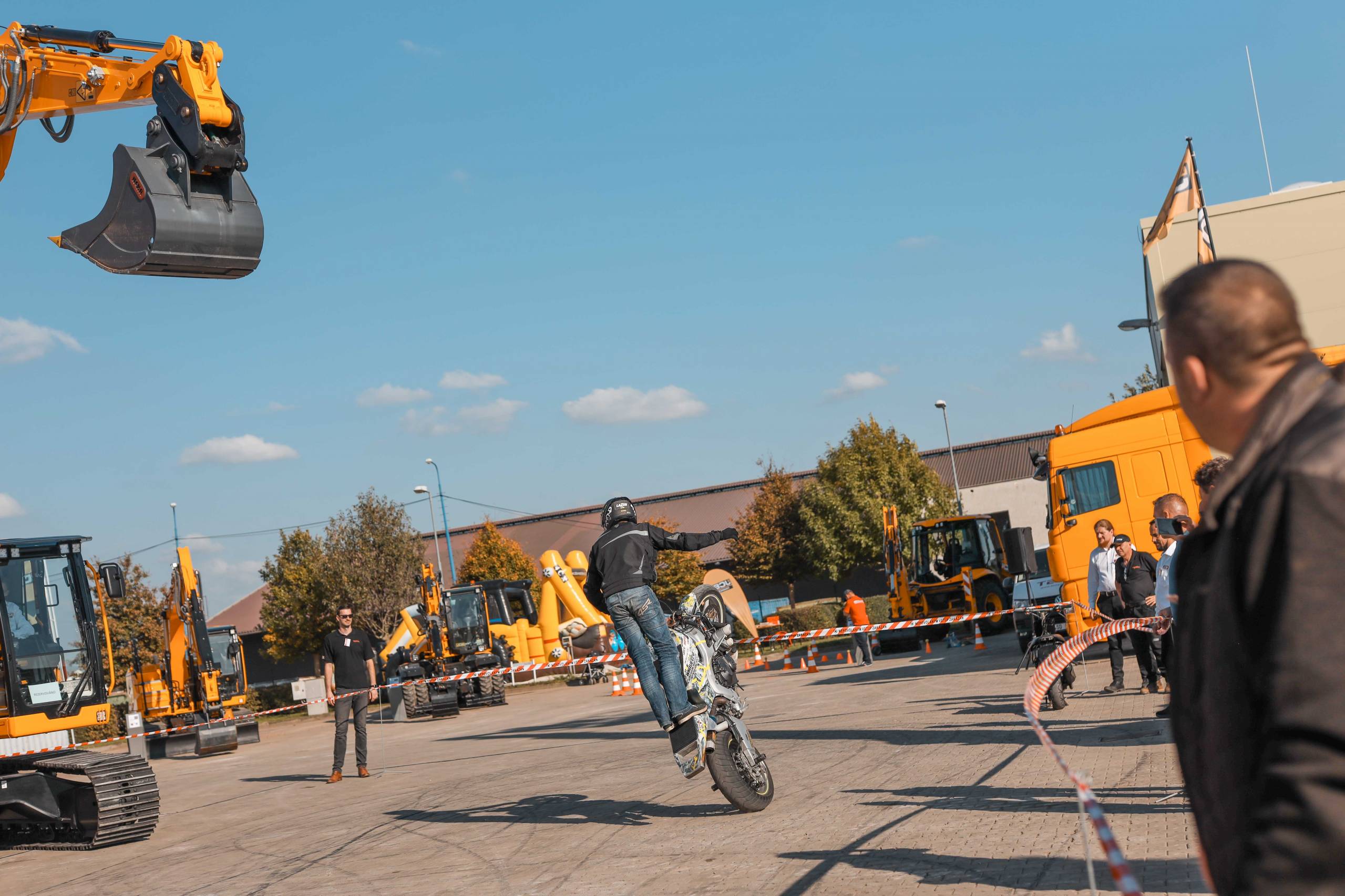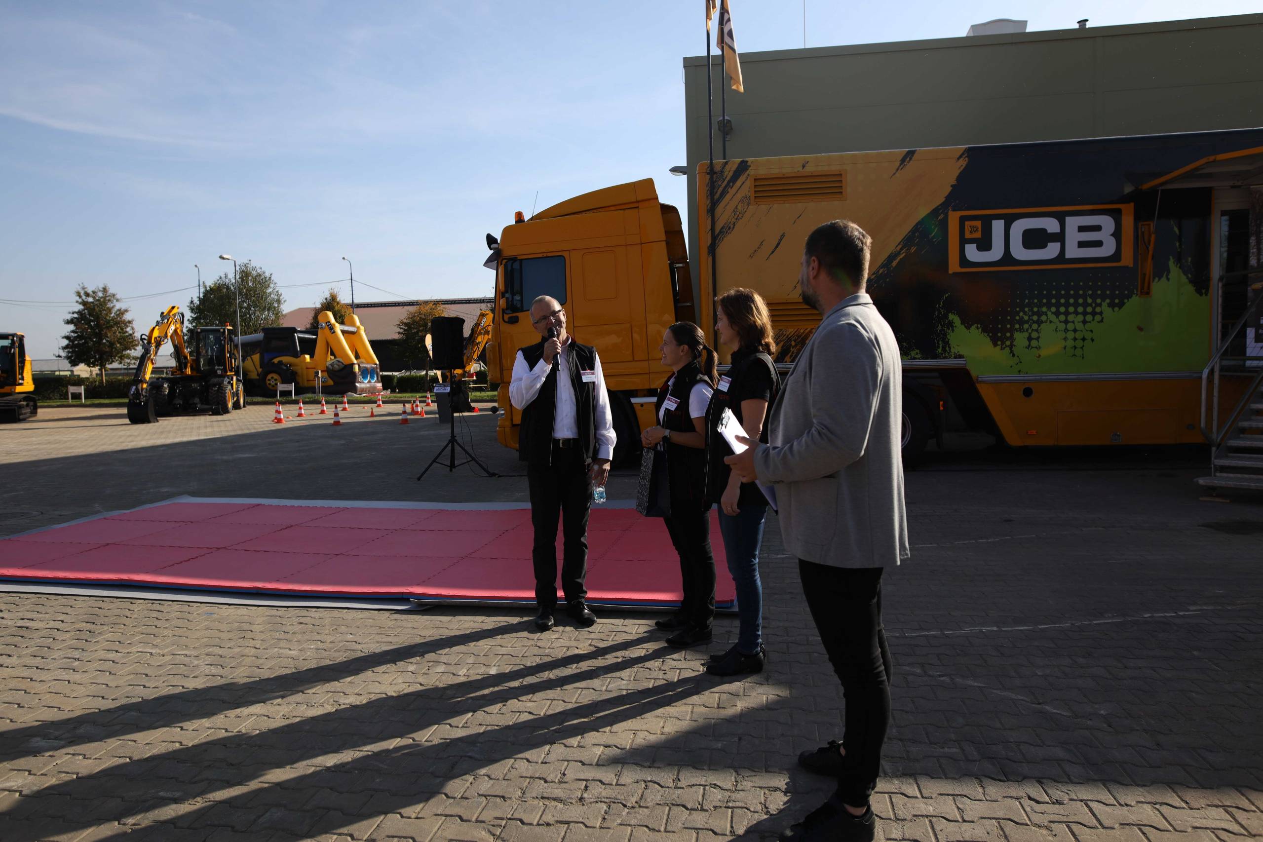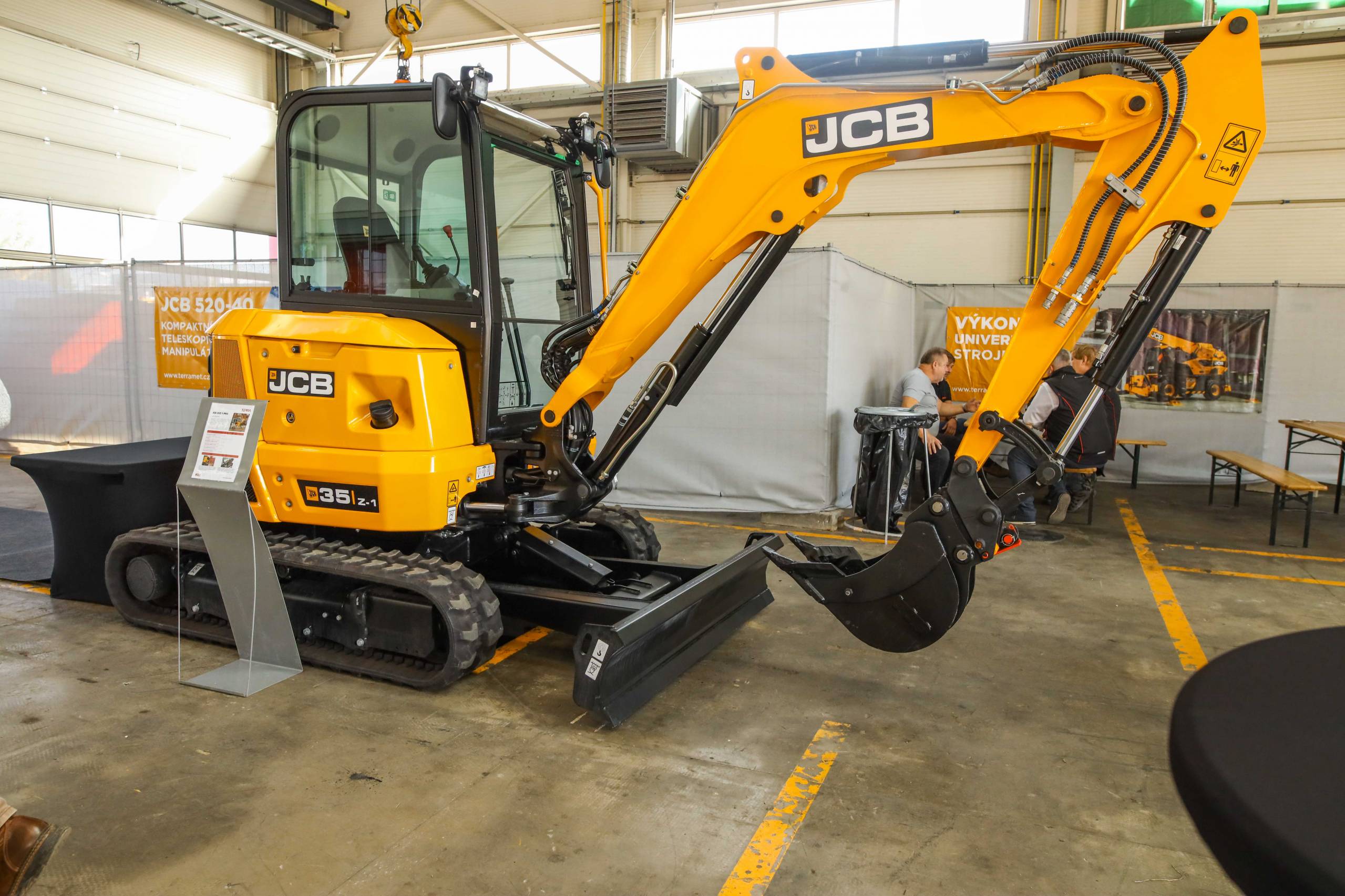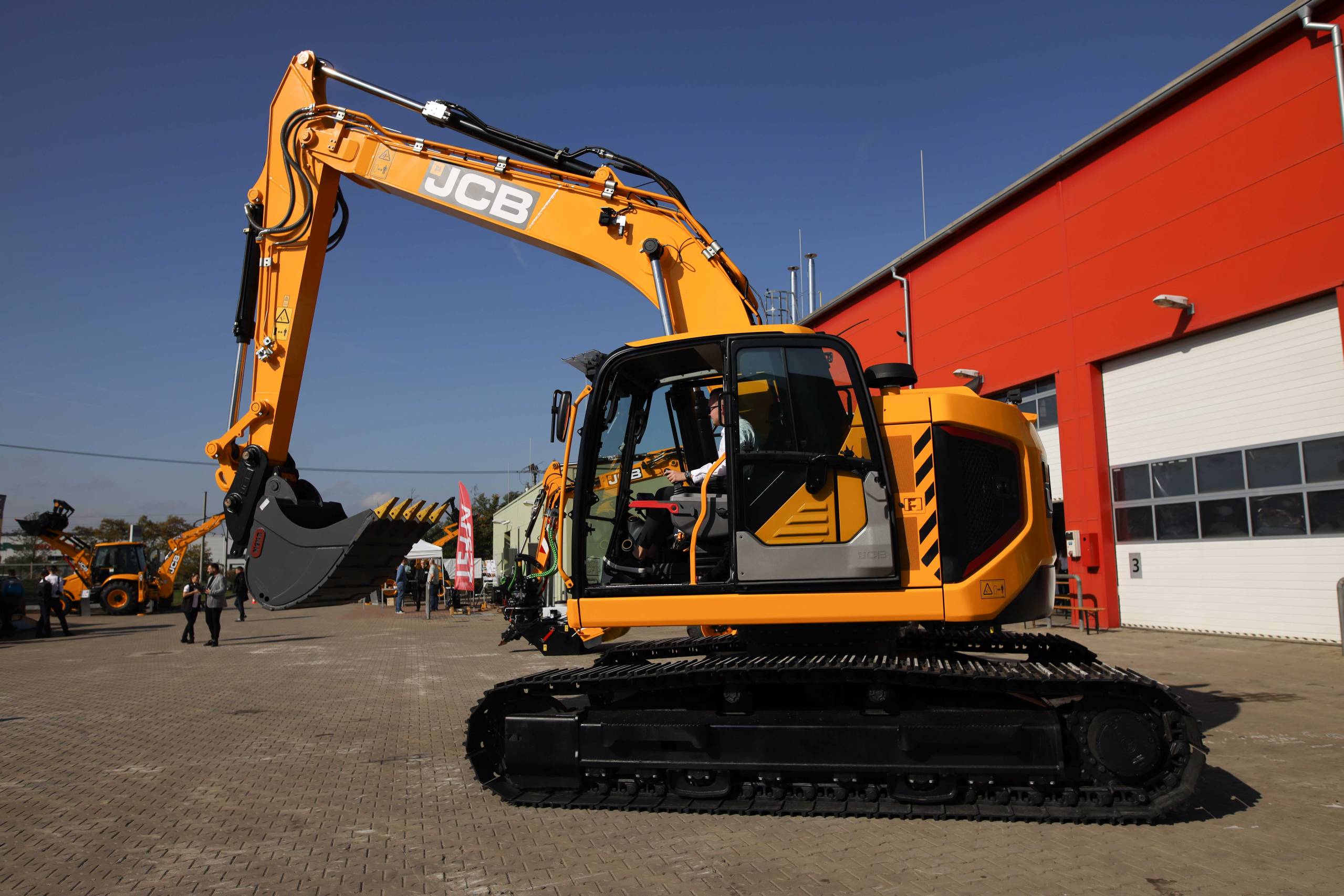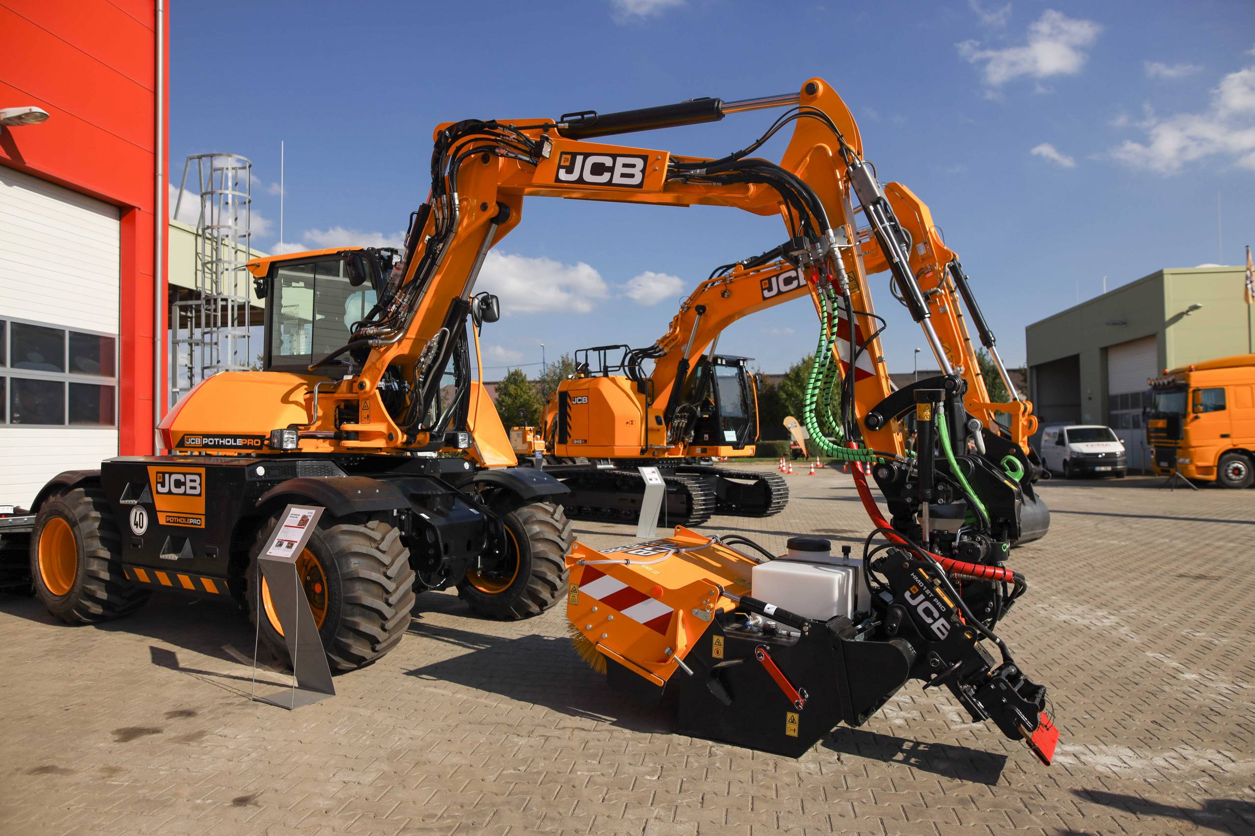 Na odstavné ploše byly zastoupeny téměř všechny naše stroje od MINI/MIDI, přes trakorbagry až po 24 tunová pásová rýpadla. Dále byly představeny naše hlavní JCB novinky unikátní Hydradig Pothole Pro určený k opravě výtluků, pásové rýpadlo JCB 245XR se zkrácenou zádí, rotační teleskopický manipulátor JCB 555-210R doplněný o plošinu na které bylo možné užít si výhled na celý areál z výšky až 21 metrů.