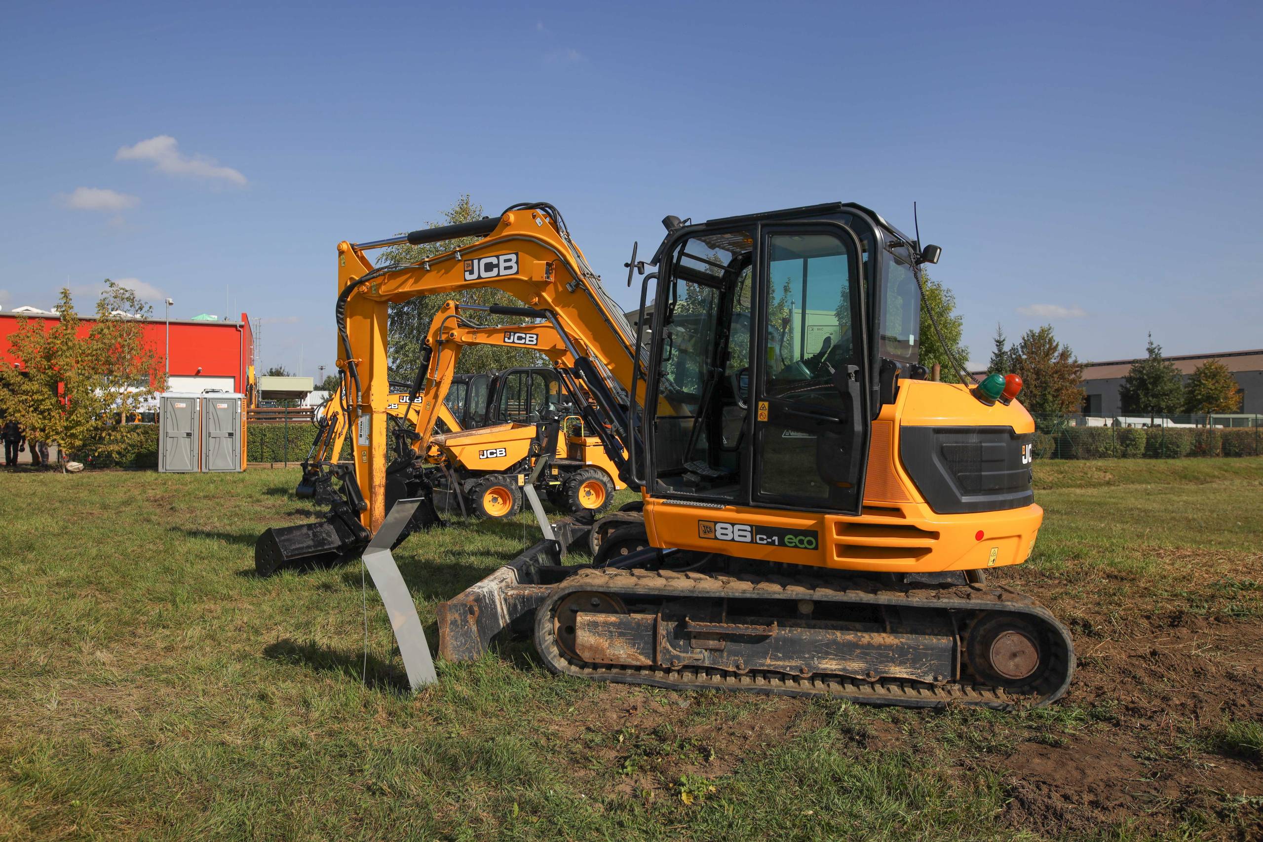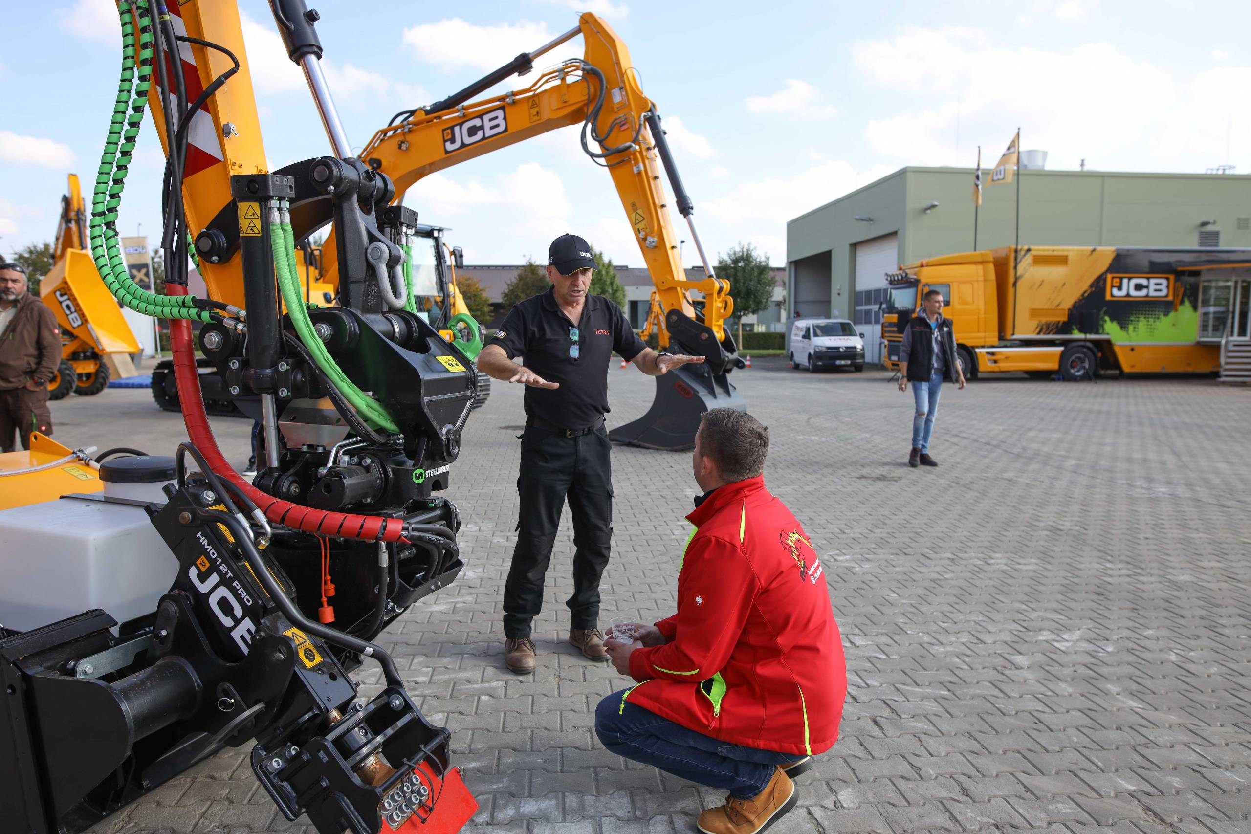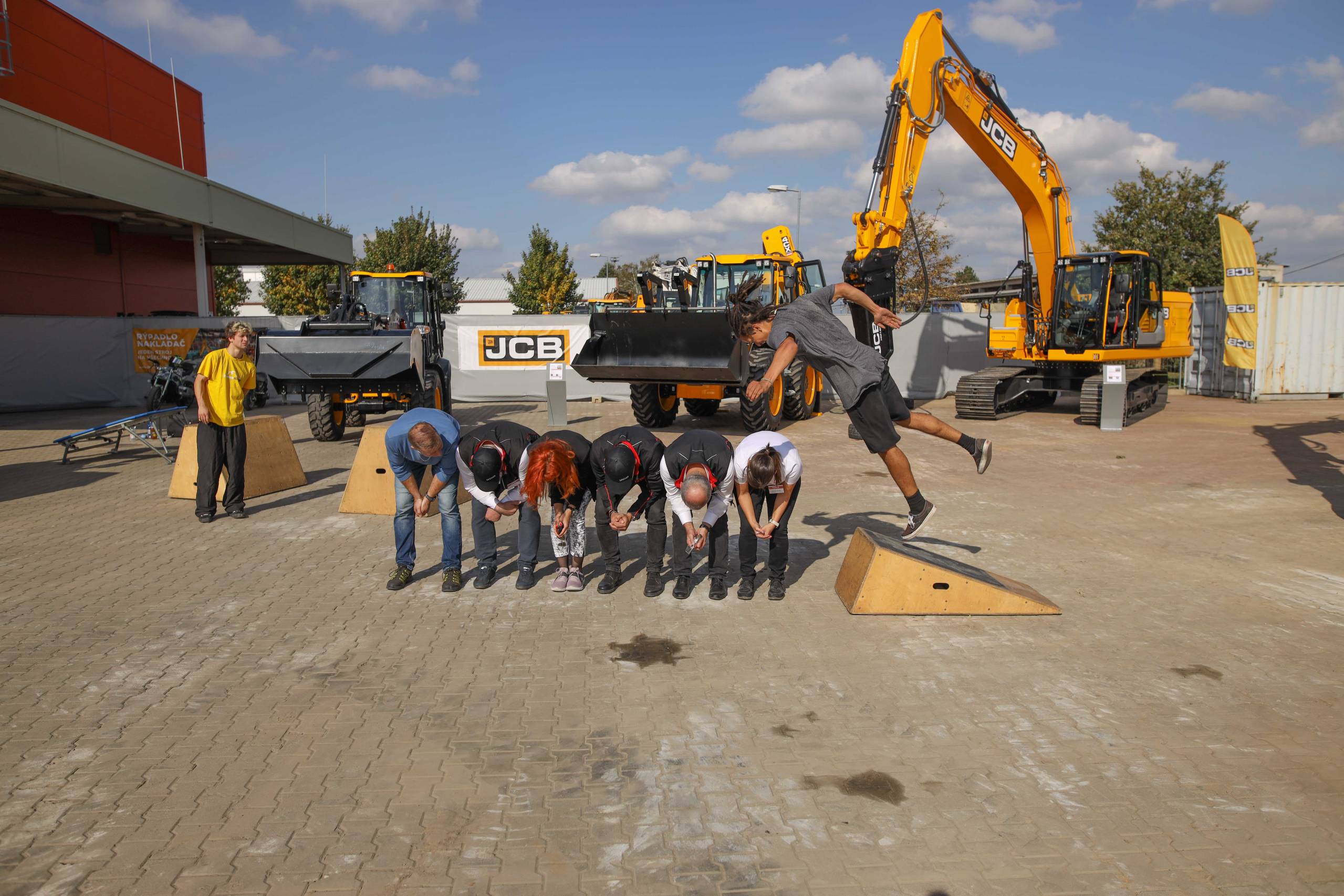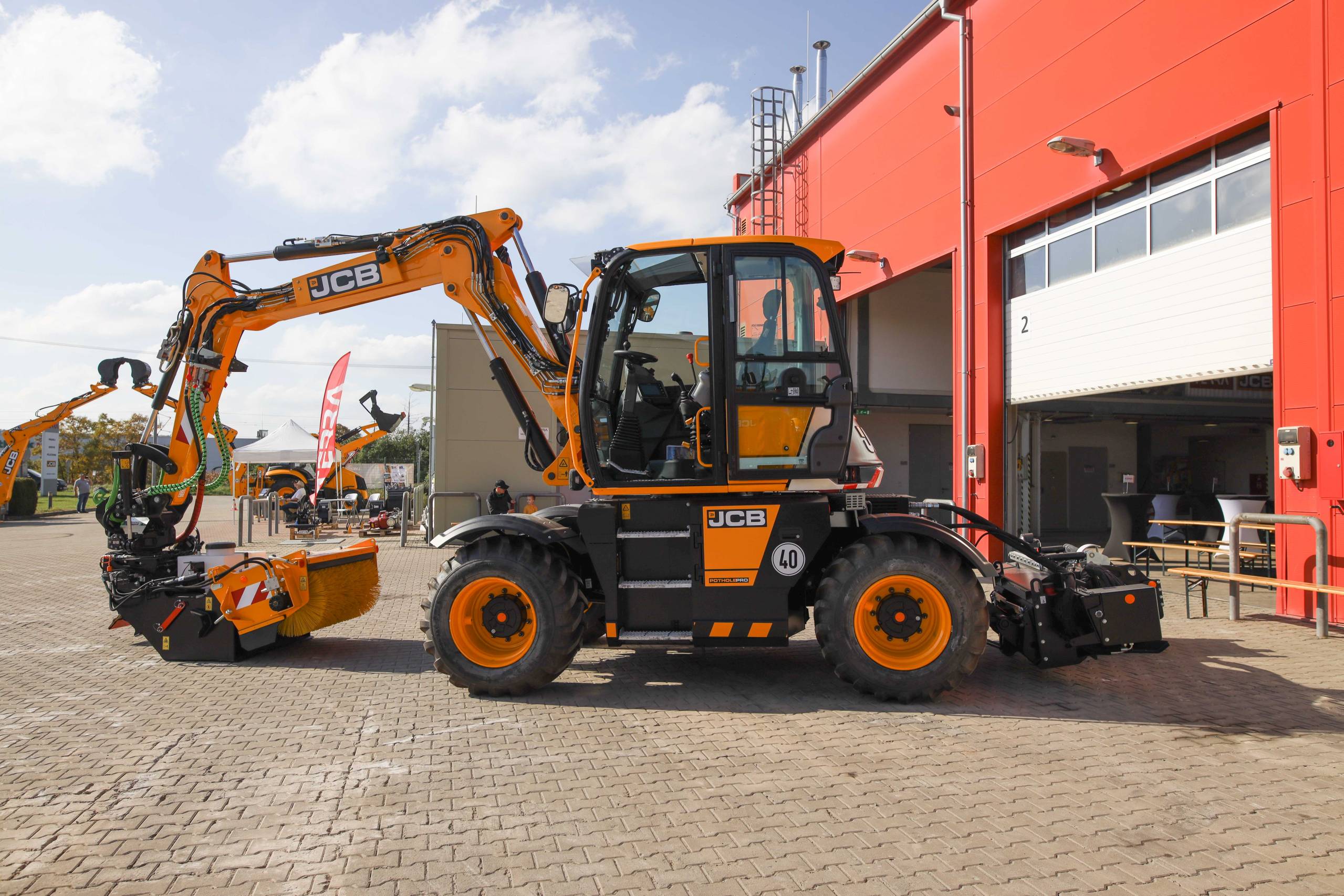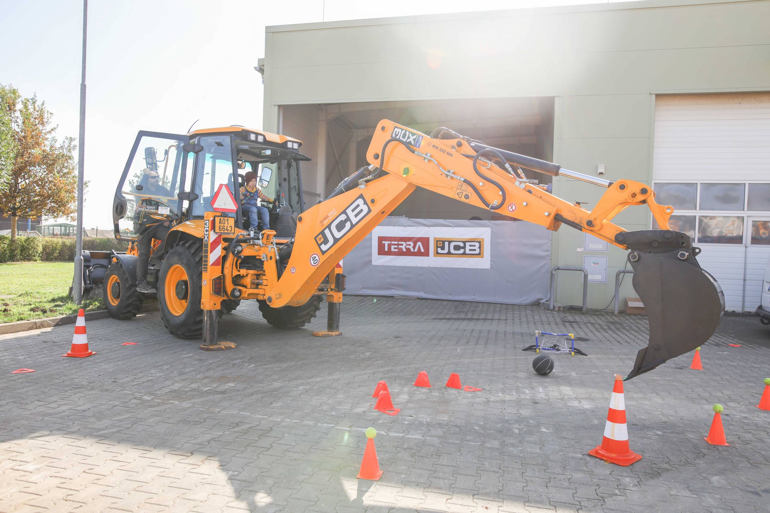 Na odstavné ploše byly zastoupeny téměř všechny naše stroje od MINI/MIDI, přes trakorbagry až po 24 tunová pásová rýpadla. Dále byly představeny naše hlavní JCB novinky unikátní Hydradig Pothole Pro určený k opravě výtluků, pásové rýpadlo JCB 245XR se zkrácenou zádí, rotační teleskopický manipulátor JCB 555-210R doplněný o plošinu na které bylo možné užít si výhled na celý areál z výšky až 21 metrů.